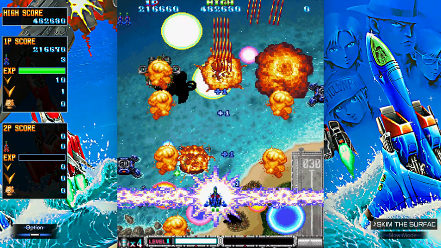 No existe diferencia entre los tipos de aeronaves en términos de rendimiento, pero estas cambian entre el Jugador 1 y 2. Asímismo, los diálogos finales cambian de acuerdo al piloto que selecciones.Acerca del modo «Original Ver.»
