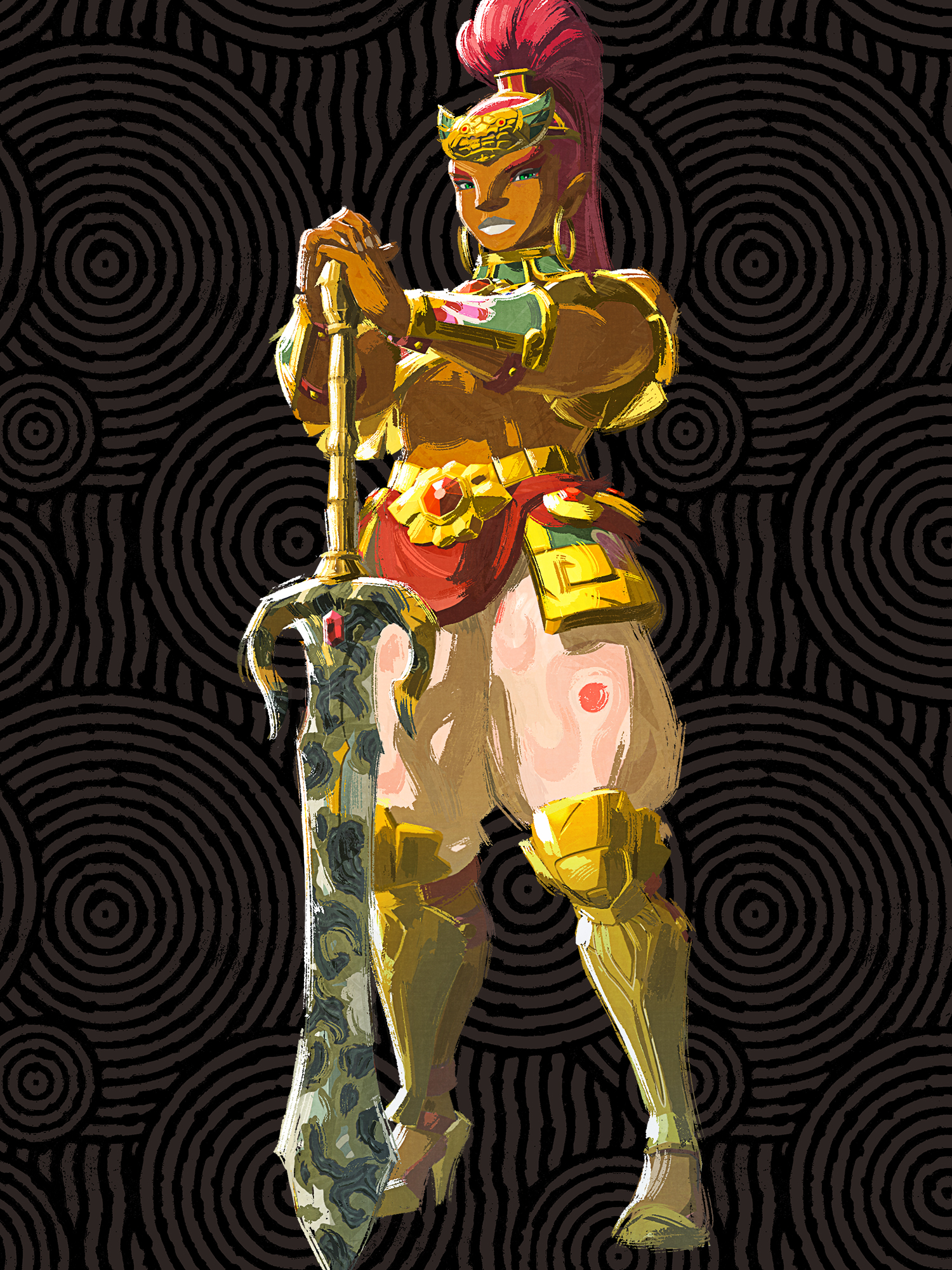 Esta es Adine, una poderosa guerrera gerudo que ejerce de guardaespaldas de Riju, la matriarca. Blande una espada gigante con la que ahuyenta (casi) todos los peligros…