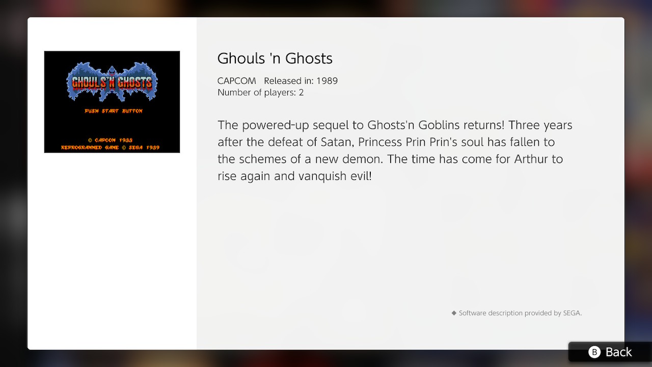 ¡Vuelve la secuela de Ghosts’n Goblins! Han pasado tres años de la derrota de Satan, pero el alma de la princesa Prin Prin ha caído en manos de un nuevo demonio. ¡Arthur tendrá que derrotar el mal una vez más!