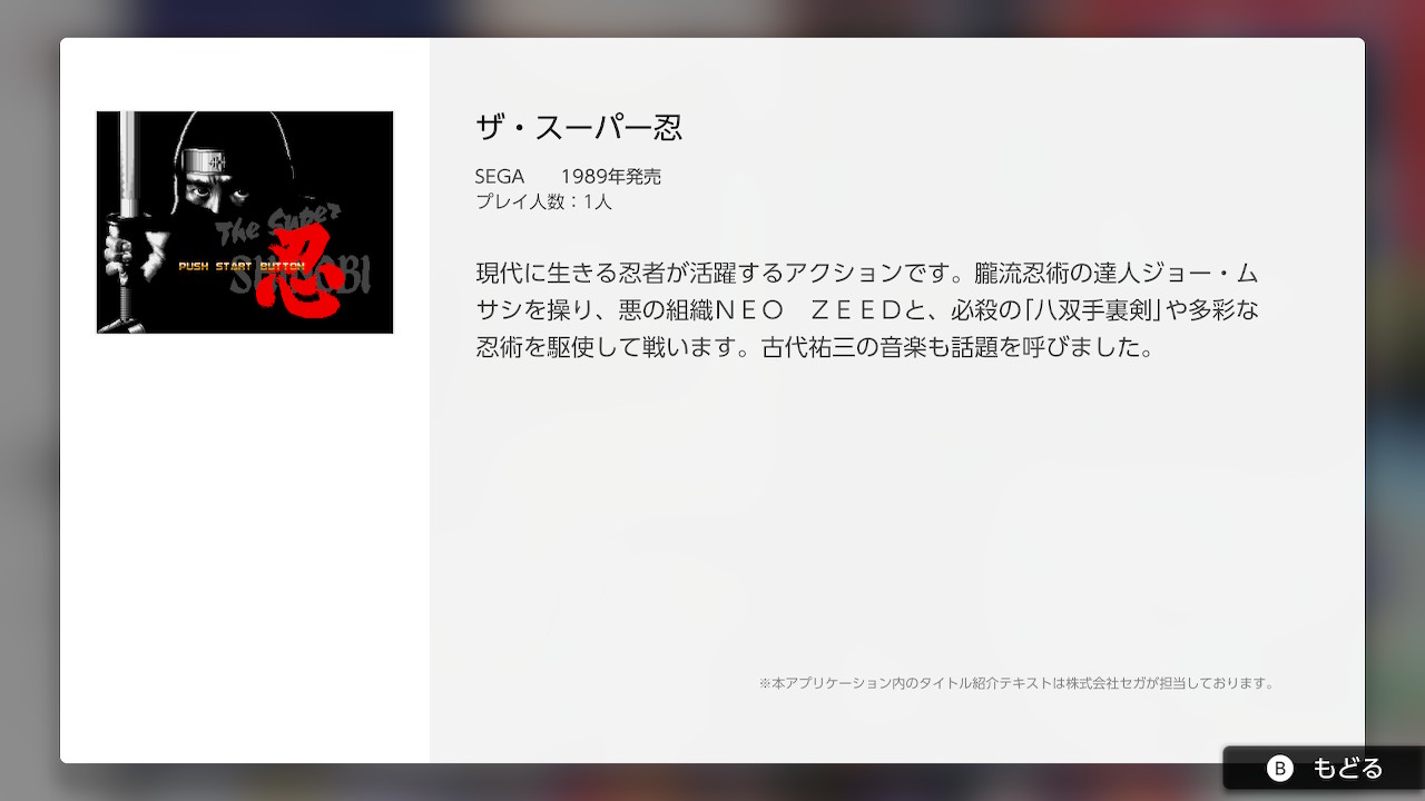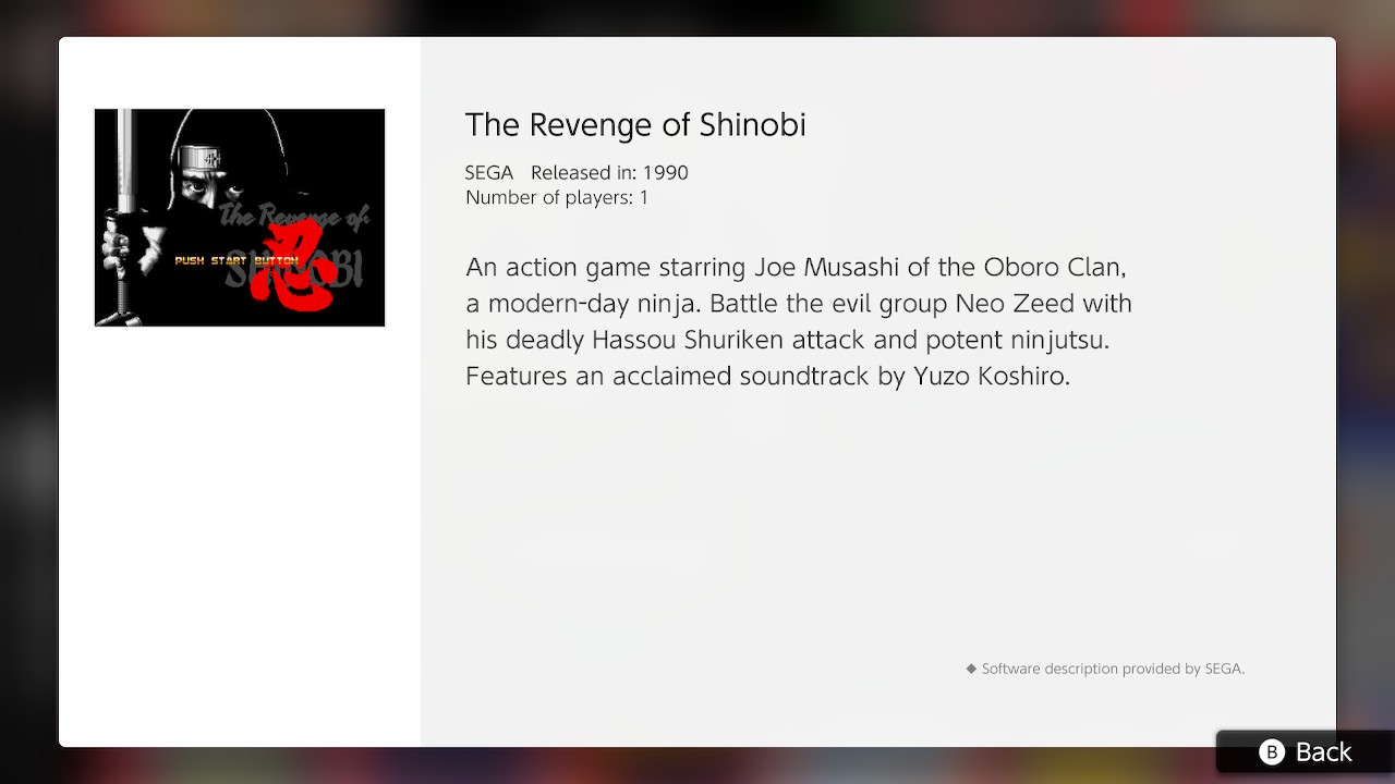 Juego de acción protagonizado por Joe Musashi, del Clan Oboro. Lucha contra el sindicato criminal Neo Zeed con sus letales shuriken y sus poderosas técnicas de ninjutsu. Banda sonora a cargo de Yuzo Koshiro.