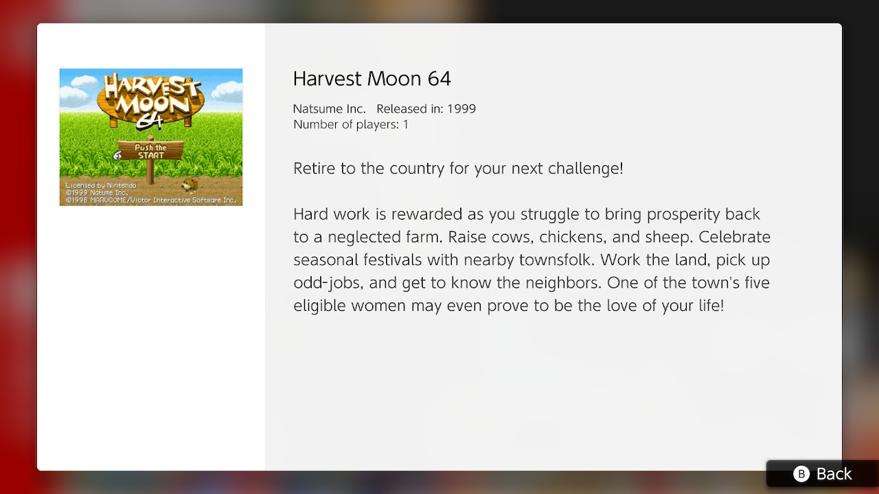 - Harvest Moon 64 – Todas las regiones, excepto Corea del Sur.