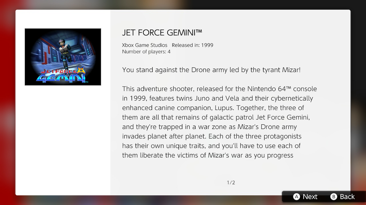 En este juego de disparos y aventura, que salió a la venta para la consola Nintendo 64 en 1999, nos presenta a los gemelos Juno y Velo que, junto con Lupus, su fiel compañero canino mejorado cibernéticamente, son lo único que queda de la patrulla galáctica Jet Force Gemini. Mientras que el ejército de drones de Mizar invade planeta tras planeta, nuestros protagonistas se ven atrapados en una zona de guerra. Cada uno posee sus propias habilidades, que tendrás que usar para liberar a las víctimas de la guerra que ha provocado Mizar mientras que a la vez avanzas a través de las múltiples fases del juego. En tu camino, encontrarás una gran variedad de pistolas, bombas y otros tipos de armas como los shuriken. ¡Úsalas sabiamente contras las fuerzas de Mizar!