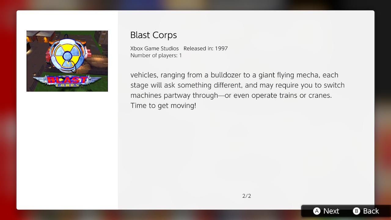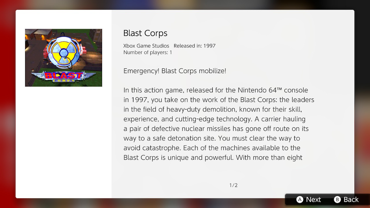 En este juego de acción, que salió para la consola Nintendo 64 en 1997, asumirás la labor de los Blast Corps, líderes en el campo de demolición pesada y conocidos por sus habilidades, su experiencia y su tecnología de punta. Un transporte con un par de misiles nucleares defectuosos, dirigido hacia un lugar de detonación segura, se salió de su ruta. Tu misión es despejar el camino para evitar una catástrofe. Todas las máquinas de las que dispones son poderosas y únicas. Contarás con más de ocho vehículos, desde un bulldozer hasta un robot volador gigante, para llevar a cabo las tareas de cada fase. Estas serán distintas en cada ocasión, lo cual requerirá que cambies de máquina, e incluso debas manejar trenes o grúas.