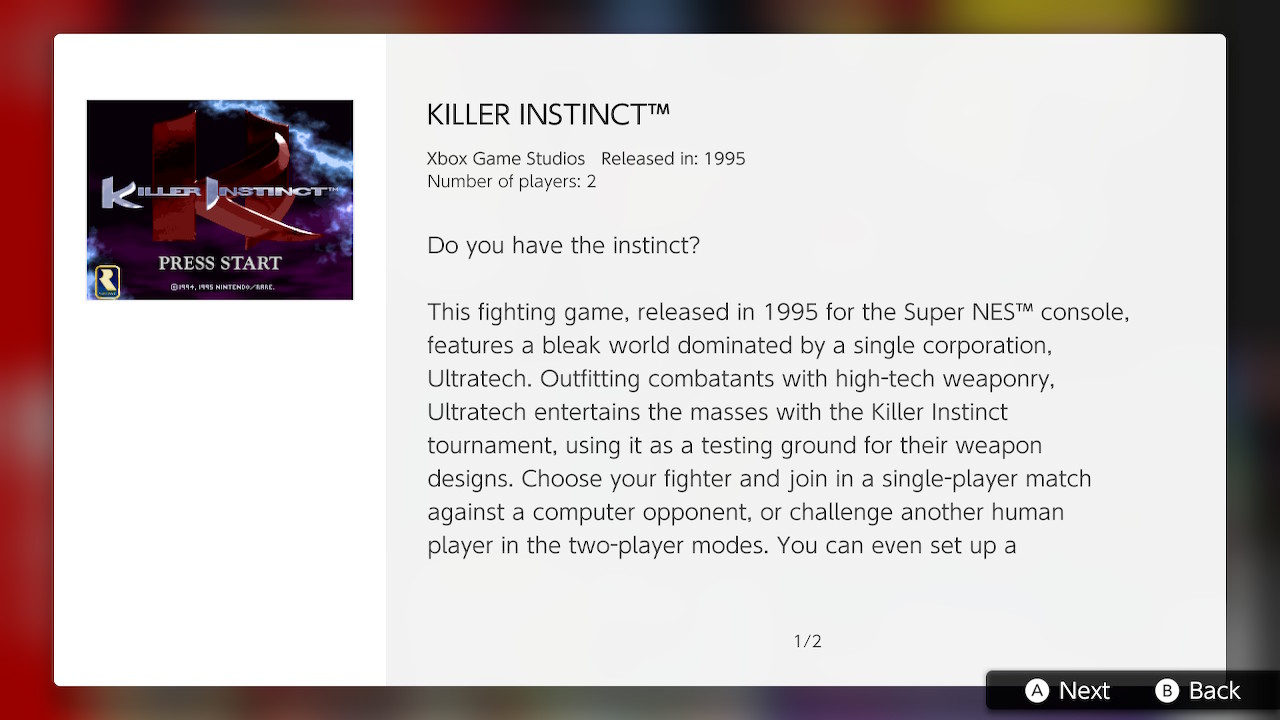 Este juego de pelea, lanzado en 1995 para la consola Super NES, se desarrolla en un mundo desolado que se encuentra dominado al completo por la Corporación Ultratech. Para mantener a las masas entretenidas, esta corporación organiza torneos de pelea bajo el nombre de «Killer Instinct», en los que los participantes han de probar las armas de ultimísima tecnología diseñadas por la corporación. Elige a tu combatiente y enfréntate a la máquina en solitario o desafía a un rival humano en una partida para dos jugadores. ¡También puedes organizar torneos de hasta ocho participantes! Lánzate sin piedad contra tu oponente y trata de encadenar ataques en forma de combos. ¿Y para anular los combos rivales? Pues tendrás que interrumpirlos con la icónica mecánica rompedora de combos de Killer Instinct: emplea ataques rápidos contra los ataques medios; ataques medios frente a los ataques feroces; o ataques feroces contra los ataques rápidos. ¡Es como si jugaras piedra, papel o tijera! Cuando tu rival esté contra las cuerdas, ¡usa la técnica «Danger Move» para darle el golpe de gracia! Lograr la victoria te costará algo más que habilidades extremas y demoledoras técnicas especiales. ¡Te hará falta tener instinto asesino!