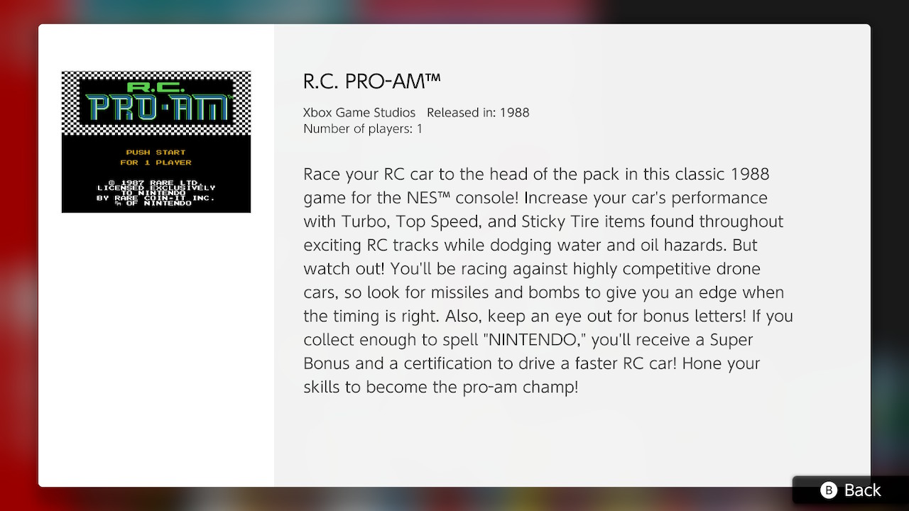 ¡Toma la delantera con tu auto teledirigido en este título clásico de 1988 para la consola NES! Aumenta las prestaciones de tu auto con objetos como Turbo, Top Speed y Sticky Tire que encontrarás a lo largo de emocionantes pistas al mismo tiempo que esquivas agua o aceite. ¡Pero ojo! Competirás contra otros autos teledirigidos y muy peligrosos que te lanzarán misiles y bombas en los momentos más inoportunos. ¡Y no pierdas de vista las letras! Si consigues las necesarias para formar la palabra «NINTENDO», ¡obtendrás un Super Bonus y un certificado para manejar un auto aún más rápido! ¡Pon a prueba tus habilidades y conviértete en una figura de la conducción de autos teledirigidos!