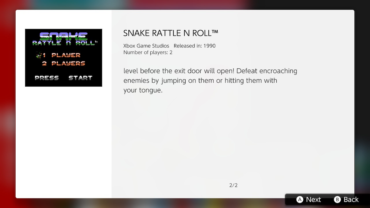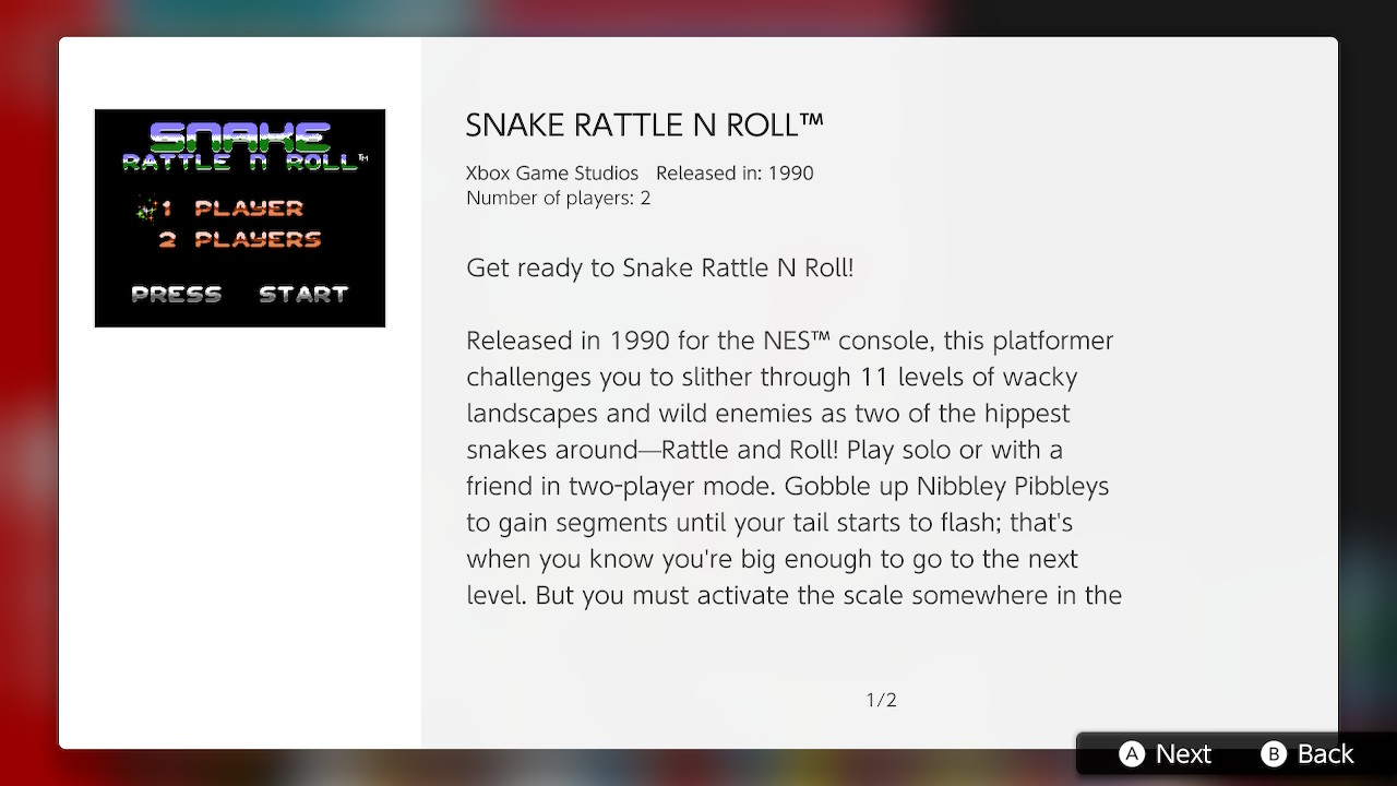 Este juego de plataformas, publicado en 1990 para la consola NES, te llevará a través de 11 niveles llenos de extravagantes escenarios y locos enemigos, a los que se enfrentarán las serpientes carismáticas: ¡Rattle y Roll! Juega en solitario o en el modo para dos jugadores. Engulle Nibble Pibbleys para que tu cuerpo gane segmentos de longitud. Cuando tu cola brille, sabrás que eres los suficientemente grande para pasar al siguiente nivel. ¡Encuentra la báscula y actívala para abrir la puerta de salida! Podrás eliminar a los enemigos que se crucen en tu camino saltando sobre ellos o golpeándolos con la lengua.