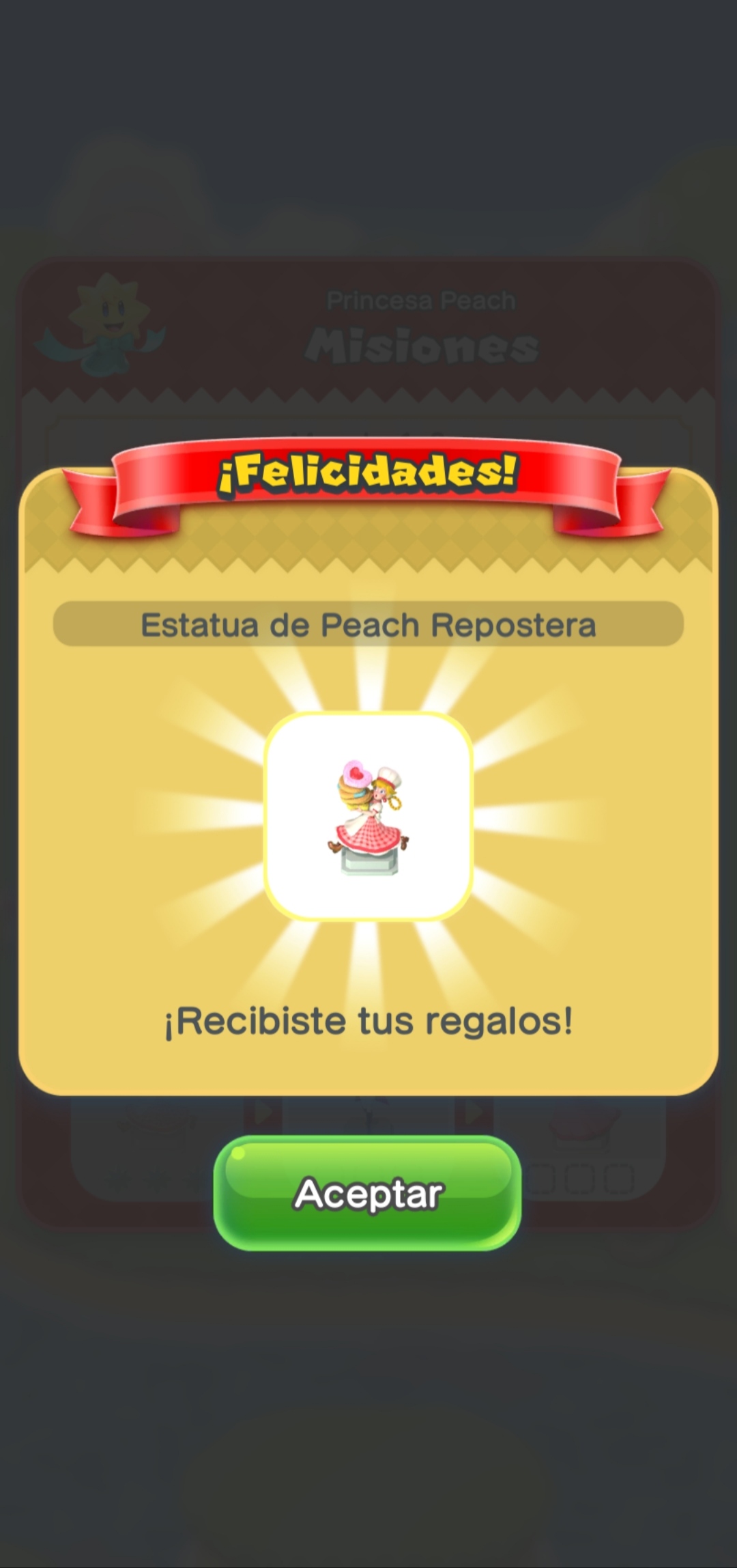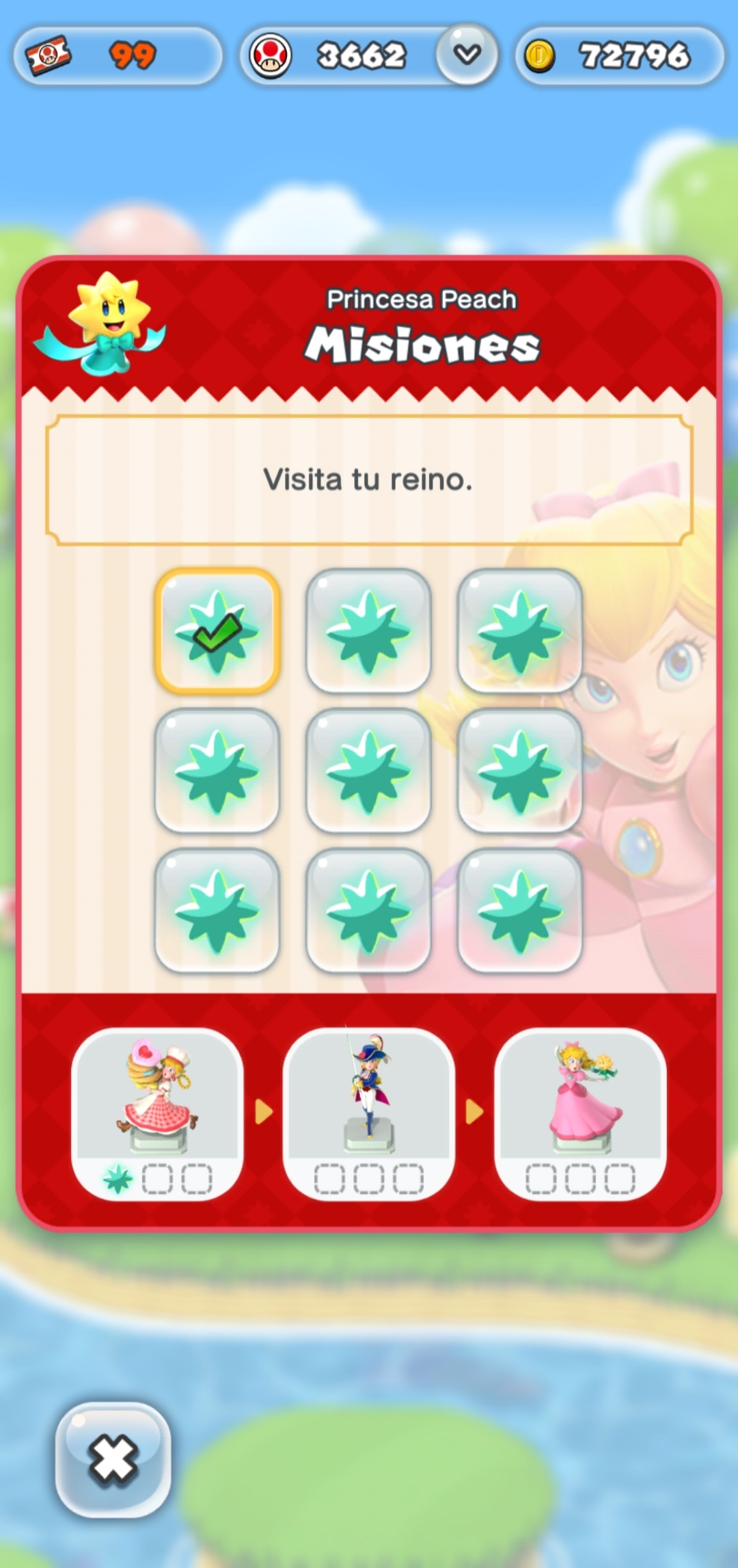Dependiendo del número de misiones cumplidas, el jugador podrá desbloquear una de las 3 estatuas disponibles, que incluyen Peach Repostera (3), Peach Espadachina (6) y Peach y Lucy (9).