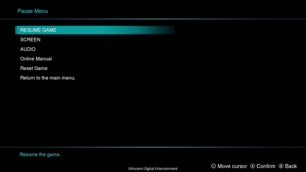 Nuevo menú de pausa. En el menú de pausa puedes cambiar los ajustes de sonido, los ajustes de pantalla (solo en Steam), consultar el manual en línea, reiniciar el juego o volver al menú principal.