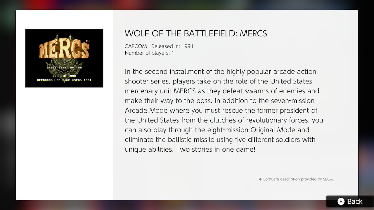 En la segunda entrega de la popular serie de juegos de acción y disparos para arcade, los jugadores asumen el papel de la unidad de mercenarios estadounidense MERCS para intentar derrotar a las hordas de enemigos hasta enfrentarse al jefe final. Además del modo Arcade, con siete misiones y en el que deberás rescatar al expresidente de los Estados Unidos, retenido por las fuerzas revolucionarias, también podrás jugar el modo original, con ocho misiones en las que tendrá que eliminar el misil balístico con cinco soldados diferentes, cada uno con habilidades únicas. ¡Dos historias en un mismo juego!