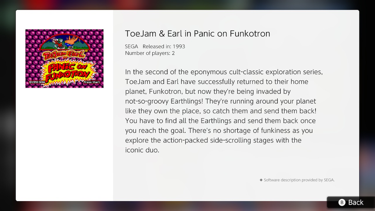En el segundo juego de esta popular serie, ToeJam y Earl han conseguido regresar a su planeta natal, Funkotron, ¡pero ahora están siendo invadidos por terrícolas que no son nada geniales! Van por el planeta como si fueran dueños del lugar, ¡así que captúralos y envíalos de vuelta! Tienes que enncontrar a todos los terrícolas y enviarlos de vuelta a su planeta una vez alcances la meta. Pásala de maravilla con el icónico dúo y explora con ellos unas fases con desplazamiento lateral en las que la acción será la protagonista.