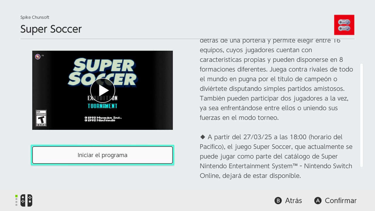 Sin embargo, el juego que quedará descatalogado, Super Soccer o Super Formation Soccer, es un juego de fútbol en perspectiva 3D, desarrollado originalmente por Human Entertainment, Inc. y lanzado en 1991 para Super Famicom y 1992 para Super NES, con Nintendo encargándose de la distribución internacional. Al momento de publicar esta entrada, se tiene desconocimiento tras los motivos de su retirada del servicio, o si esta será de manera temporal, y actualmente, los derechos del juego están en manos de Spike Chunsoft.