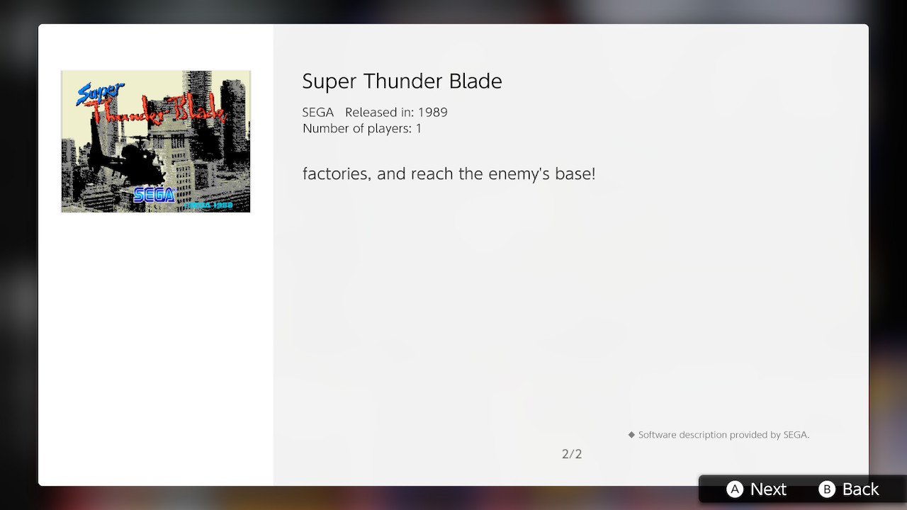 Este juego de disparos salió a la venta originalmente como el séptimo juego con simulador de movimiento de SEGA parra arcade. Más tarde fue rehecho y salió como título de lanzamiento para Genesis/Mega Drive. Pilotea el helicóptero de combate Super Thunder Blade y enfréntate a las hordas de guerrilleros. Entre tus armas se encuentran el cañón Vulcan y los misiles rastreadores. Cada fase consta de dos escenarios: uno es un juego de disparos 3D de dos partes con un jefe entre ambas y un juego de disparos 2D en el que tendrás que destruir un arma gigante desde arriba. La gran movilidad del helicóptero supondrá una gran ventaja durante el combate. ¡Cambia de velocidad a voluntad, viaja a través de cuevas y fábricas y llega a la base del enemigo!