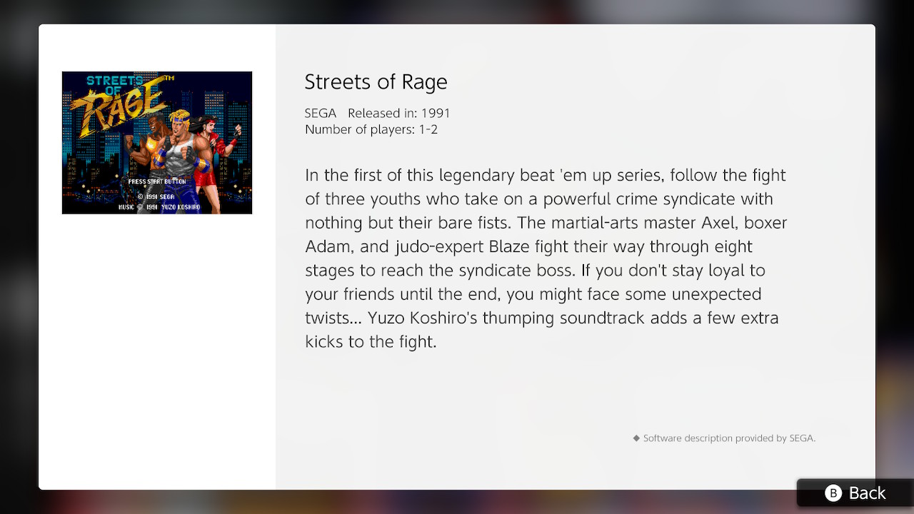 En el debut de la legendaria serie de juegos de peleas callejeras, seguirás los pasos de tres jóvenes que se enfrentan a un poderoso sindicato del crimen con sus puños. El maestro de artes marciales Axel, el boxeador Adam y la experta en judo Blaze tendrán que abrirse camino a través de ocho fases para poder ajustar cuentas con el jefe del sindicato. Si no te mantienes leal a tus amigos hasta el final, es posible que te enfrentes a algunos giros inesperados… La mítica banda sonora de Yuzo Koshiro crea una atmósfera inigualable para las peleas.