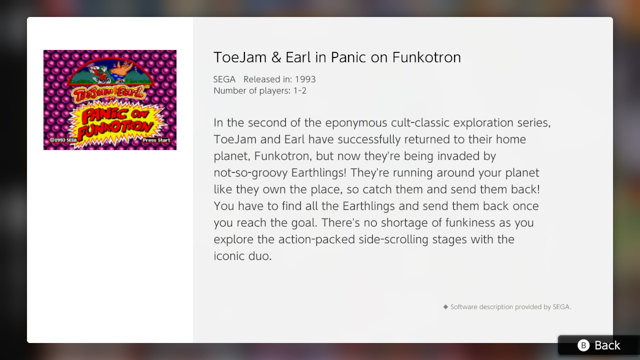 Un cambio menor que también se ha realizado en las aplicaciones de Sega Genesis y Mega Drive del Switch Online está en la contabilización de jugadores en las descripciones de cada uno de los juegos que tienen opción multijugador, indicando ahora que estos títulos pueden jugarse de 1 a 2 jugadores. Para referencia, puedes ver las descripciones de ToeJam & Earl in Panic on Funkotron, añadido en noviembre de 2024, entre las versiones 3.0.0 y 3.1.1: