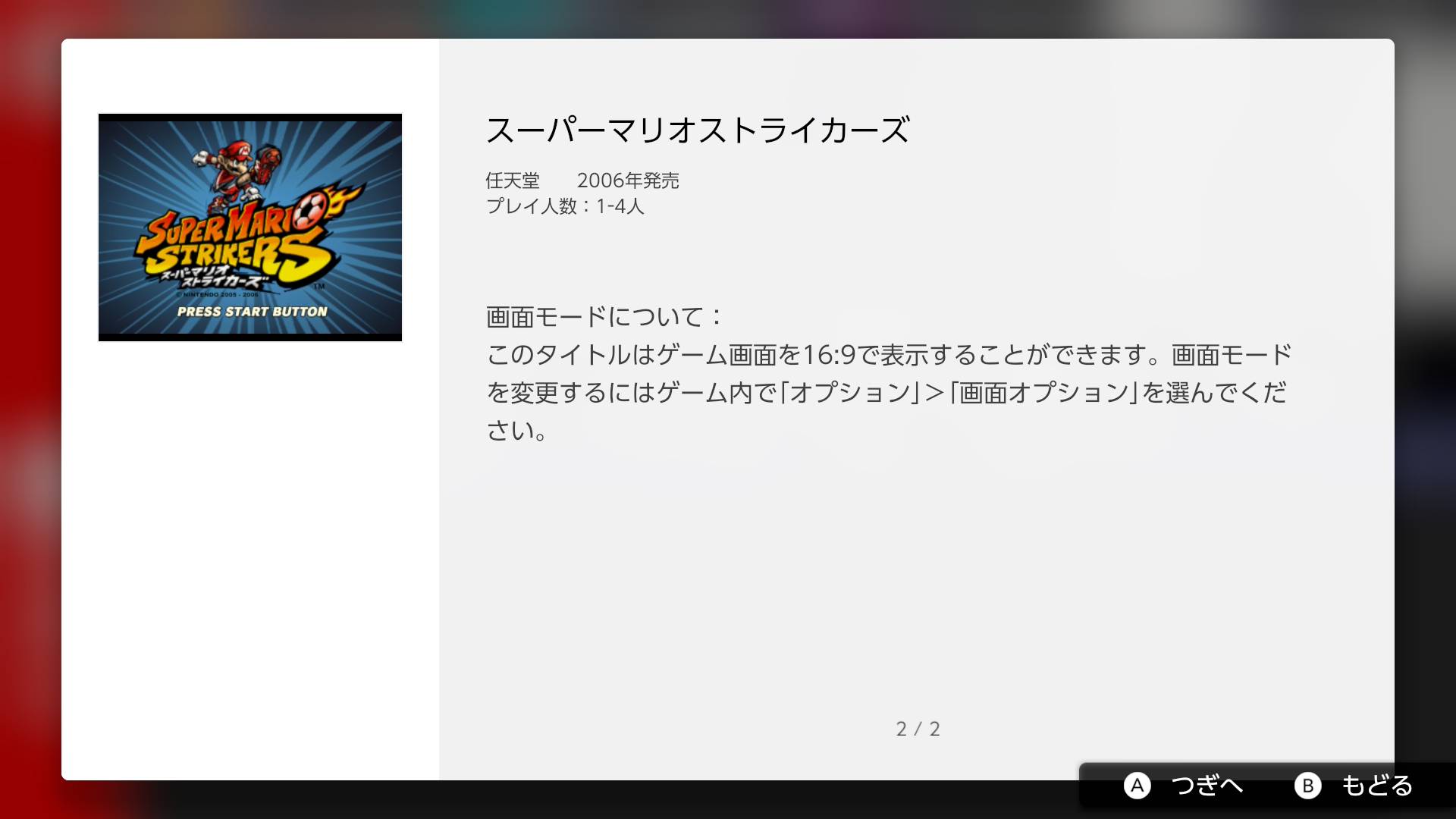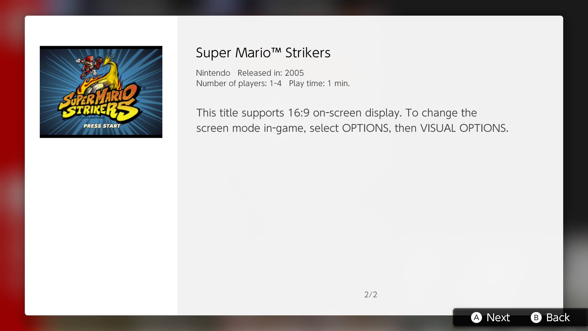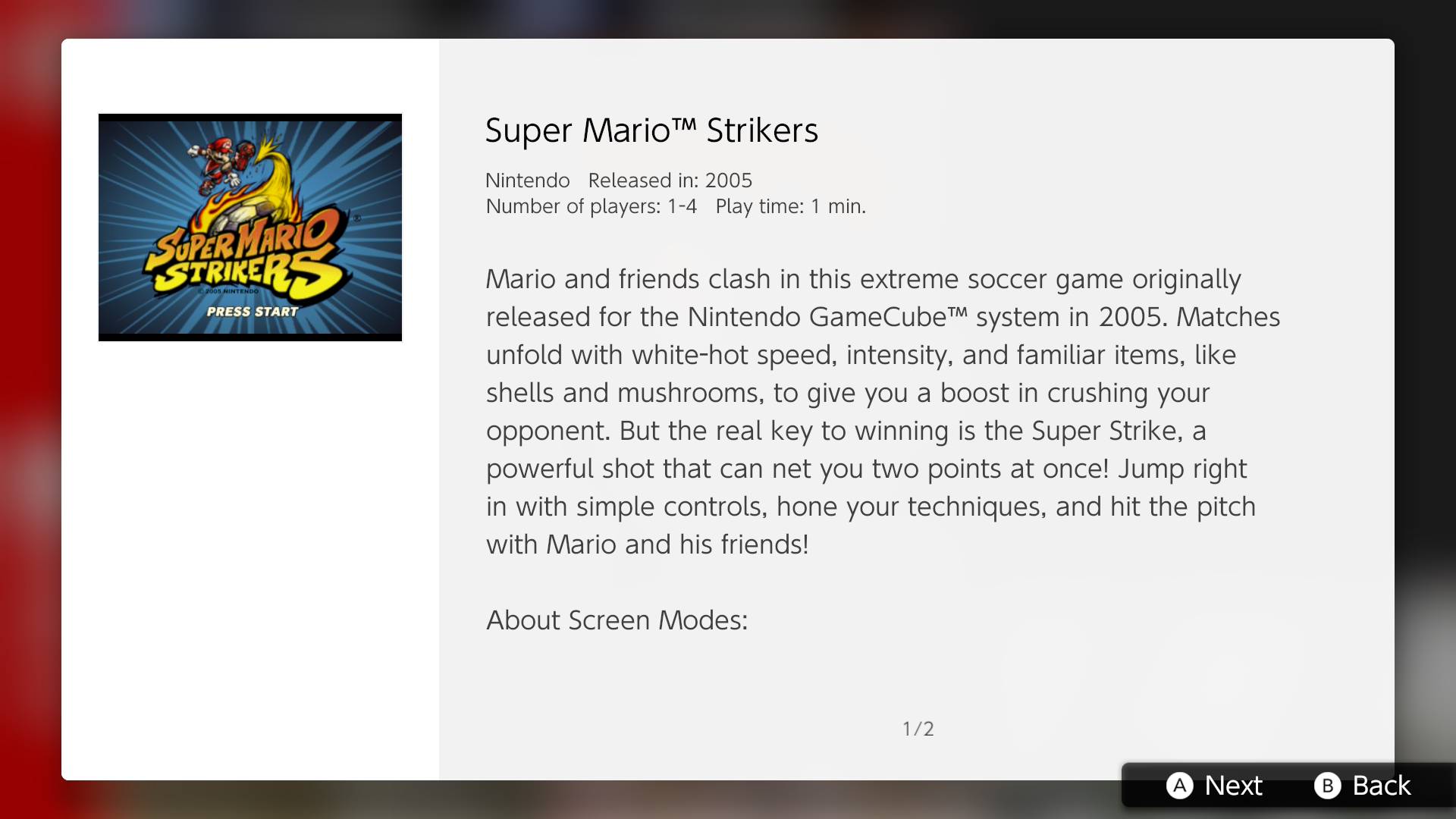 A continuación, se presentará la descripción para Super Mario Strikers en este relanzamiento. Agradecimientos especiales a Mahiro Kudo por proporcionarme todas las capturas presentes en este artículo.