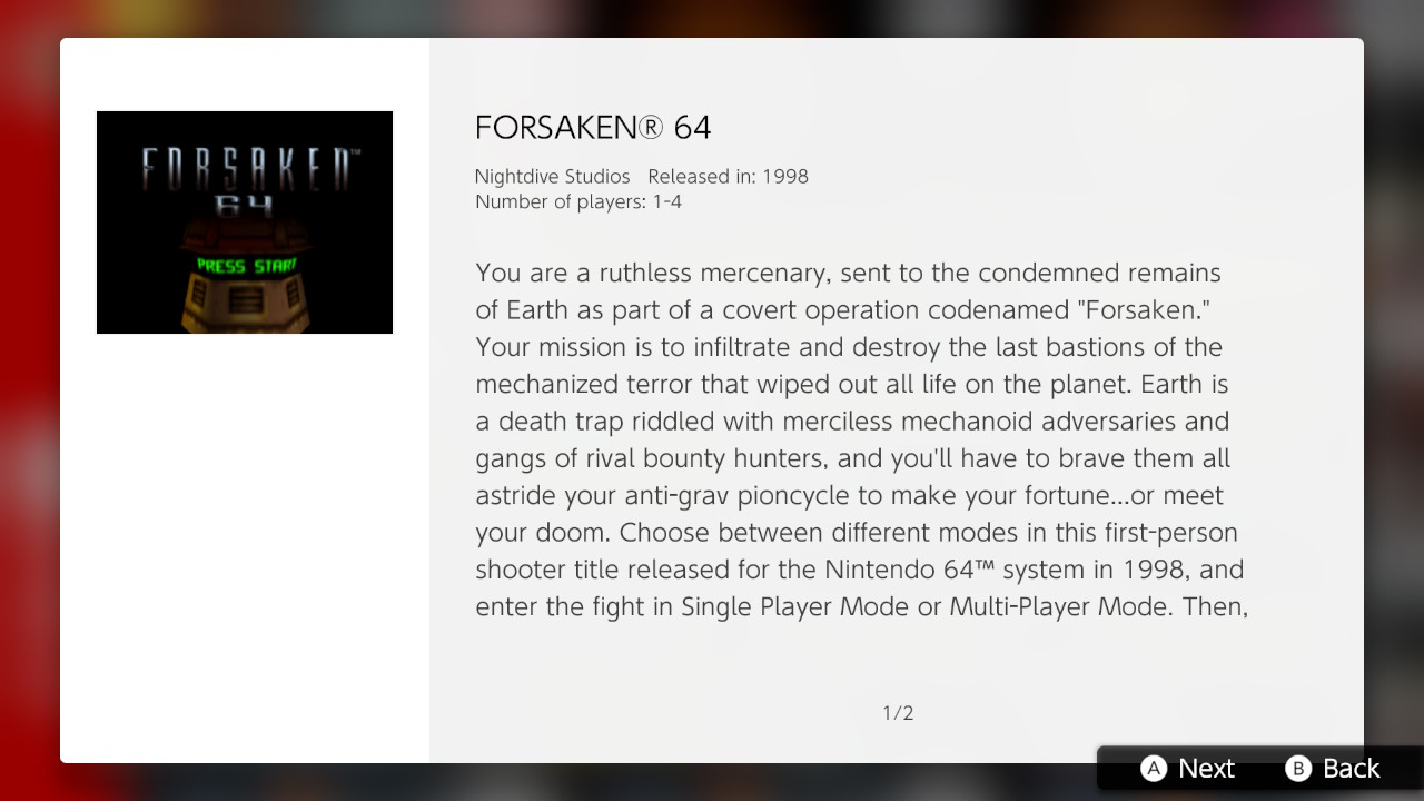 Asume el papel de un implacable mercenario al que han enviado a las ruinas de la Tierra como parte de una desesperada operación con el nombre clave «Forsaken». Tu misión será infiltrarte y destruir los últimos bastiones de engendros mecánicos que han aniquilado por completo la vida en el planeta. La Tierra se ha tornado en una trampa mortal asolada por malvados entes mecanoides y bandas de cazarrecompensas, a los que deberás enfrentarte mientras tu pioncycle te conduce en busca de fortuna… o de tu fin. Este título de disparos en primera persona, publicado en 1998 para Nintendo 64™, permite elegir entre varios modos de juego y entrar en la batalla en modo para un solo jugador o modo multijugador. Las características particulares de cada vehículo determinarán como afrontas el desafío. Elige la que mejor encaje con tu estilo para cada misión. Las armas disponibles, los enemigos y los potenciadores varían según el nivel, ¡así que mantente alerta!