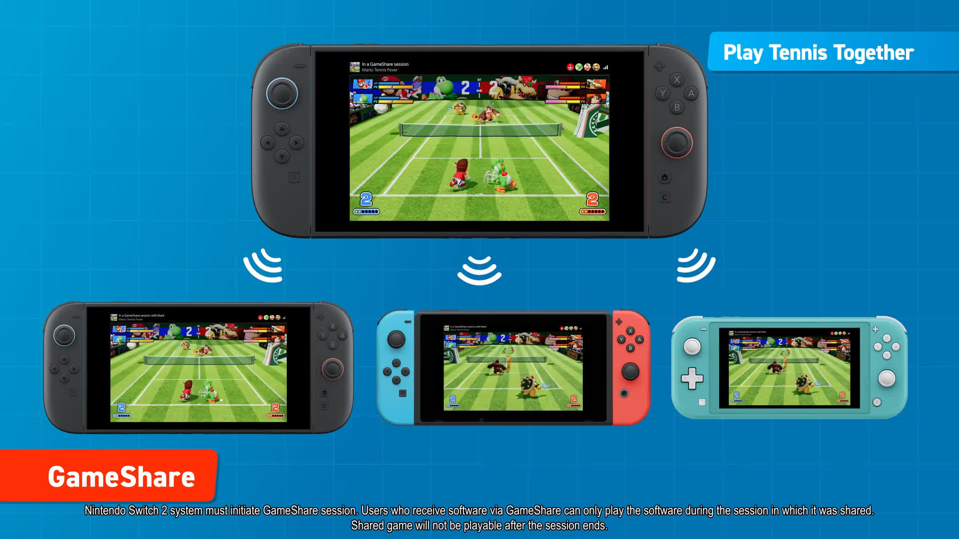 El título es compatible con la funcionalidad de «GameShare», donde una persona con una copia del título puede jugar con hasta tres jugadores con sus consolas Nintendo Switch y/o Nintendo Switch 2 de forma local, y con los amiibo, que al escanear cualquiera de la serie Mario permitirá desbloquear diseños basados en los personajes para la pelota de tenis.