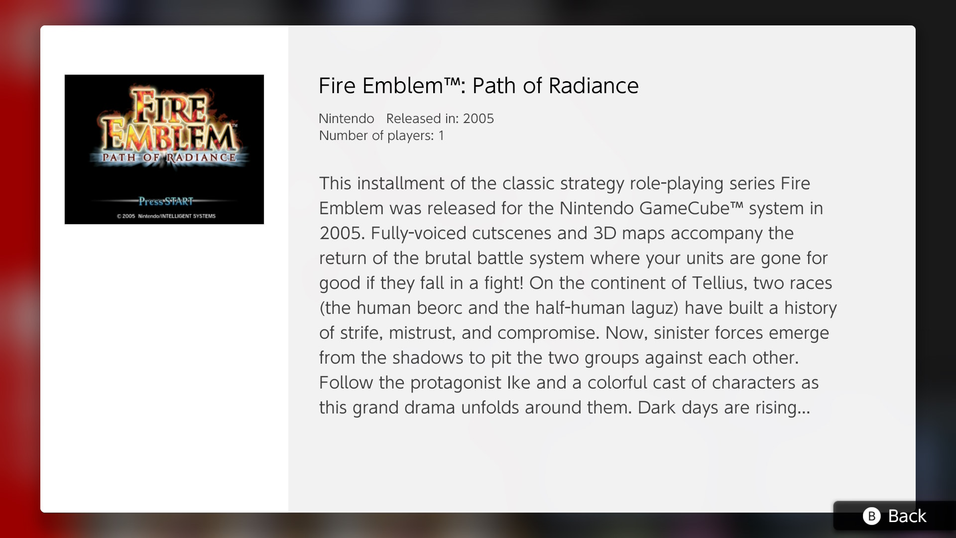 N.° de jugadores: 1Esta entrega de Fire Emblem, la clásica serie de juegos de rol y estrategia, salió en 2005 para la consola Nintendo GameCube™. Su feroz sistema de combate, donde las unidades caídas se pierden para siempre, viene en esta ocasión con animaciones con voz y mapas en 3D. En el continente de Tellius, el pueblo humano beorc y el semihumano laguz comparten un pasado de convivencia entre recelos y conflictos. Ahora, un siniestro poder surge de las tinieblas para sembrar discordia entre ambas razas. Únete a nuestro protagonista, Ike, y a un elenco de diversos personajes, en esta épica aventura. Vienen días oscuros…