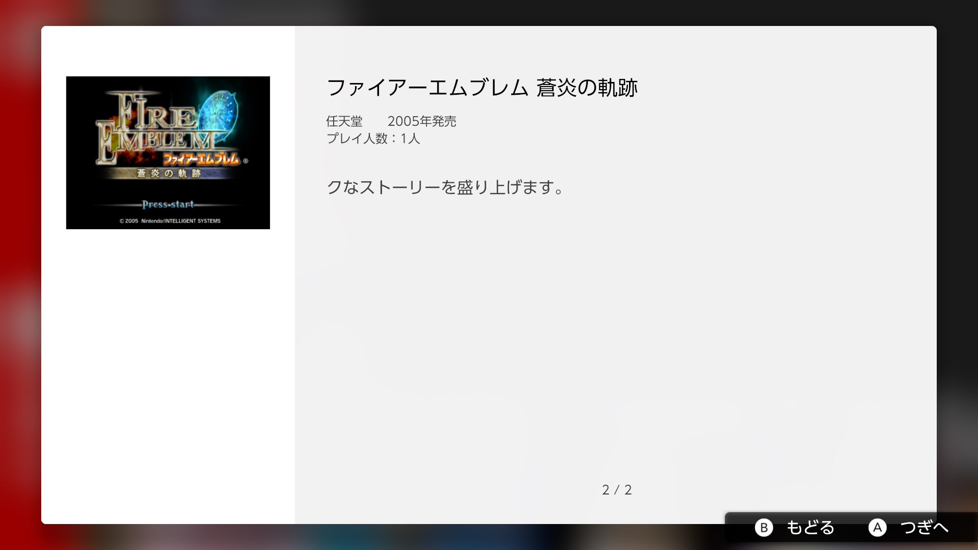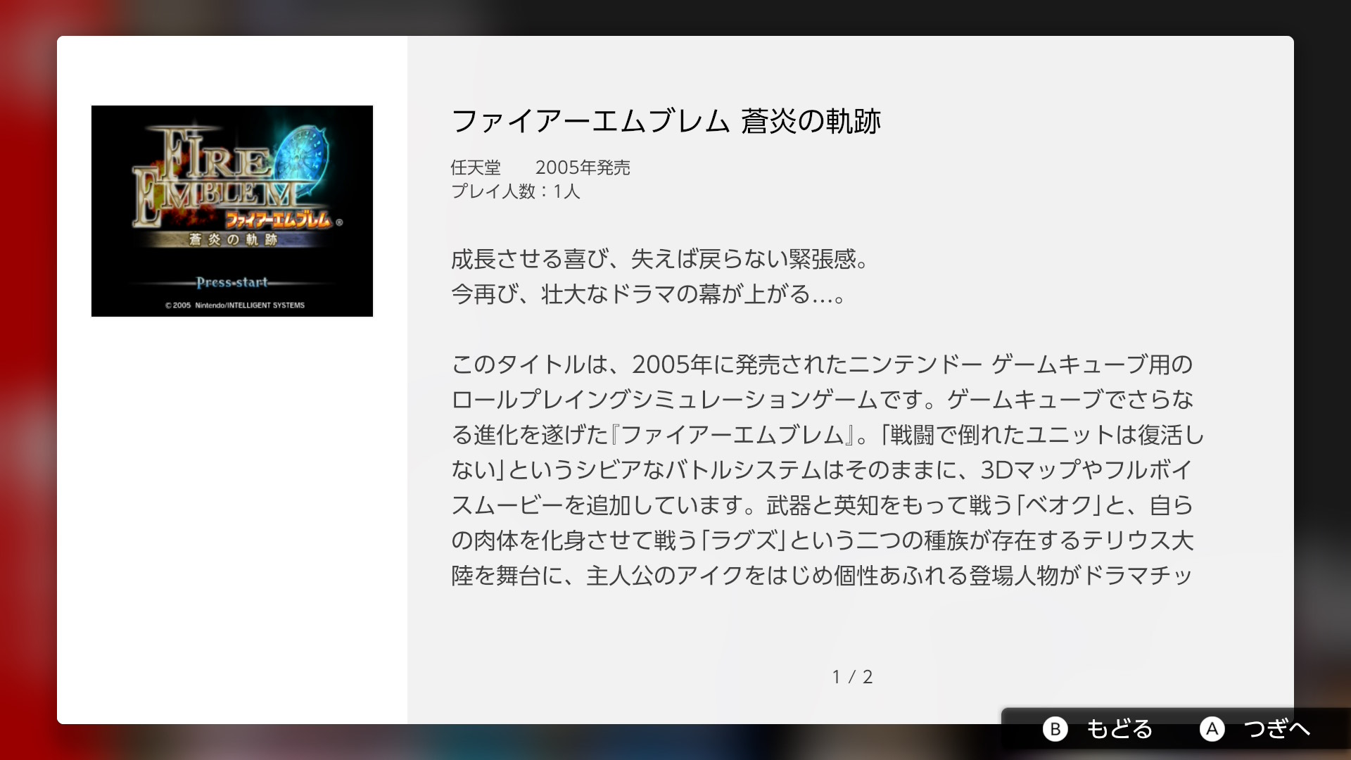 Sin más que añadir de momento, les presentamos la descripción en Español otorgada a Fire Emblem: Path of Radiance para este relanzamiento, acompañado de varias capturas del menú. Agradecimientos especiales nuevamente a Mahiro Kudo por proporcionarme la información y capturas relacionadas a este relanzamiento.
