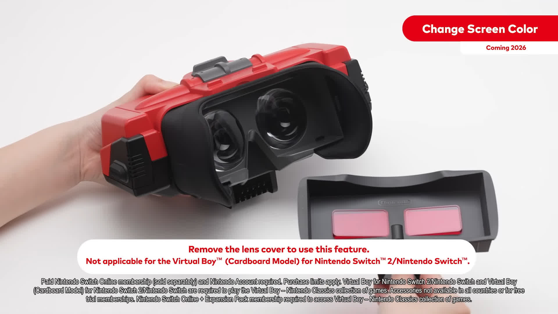 Una función adicional que estará disponible en una actualización futura es la posibilidad de cambiar el color de la pantalla, pudiéndose elegir entre tonalidades de verde, amarillo y rojo, además de blanco y grises. Para utilizar esta función desde la réplica casi exacta de la Virtual Boy para miembros del Switch Online, solo se necesita remover el visor con lentes rojizos de las gafas, el cual no está presente en el modelo de cartón.