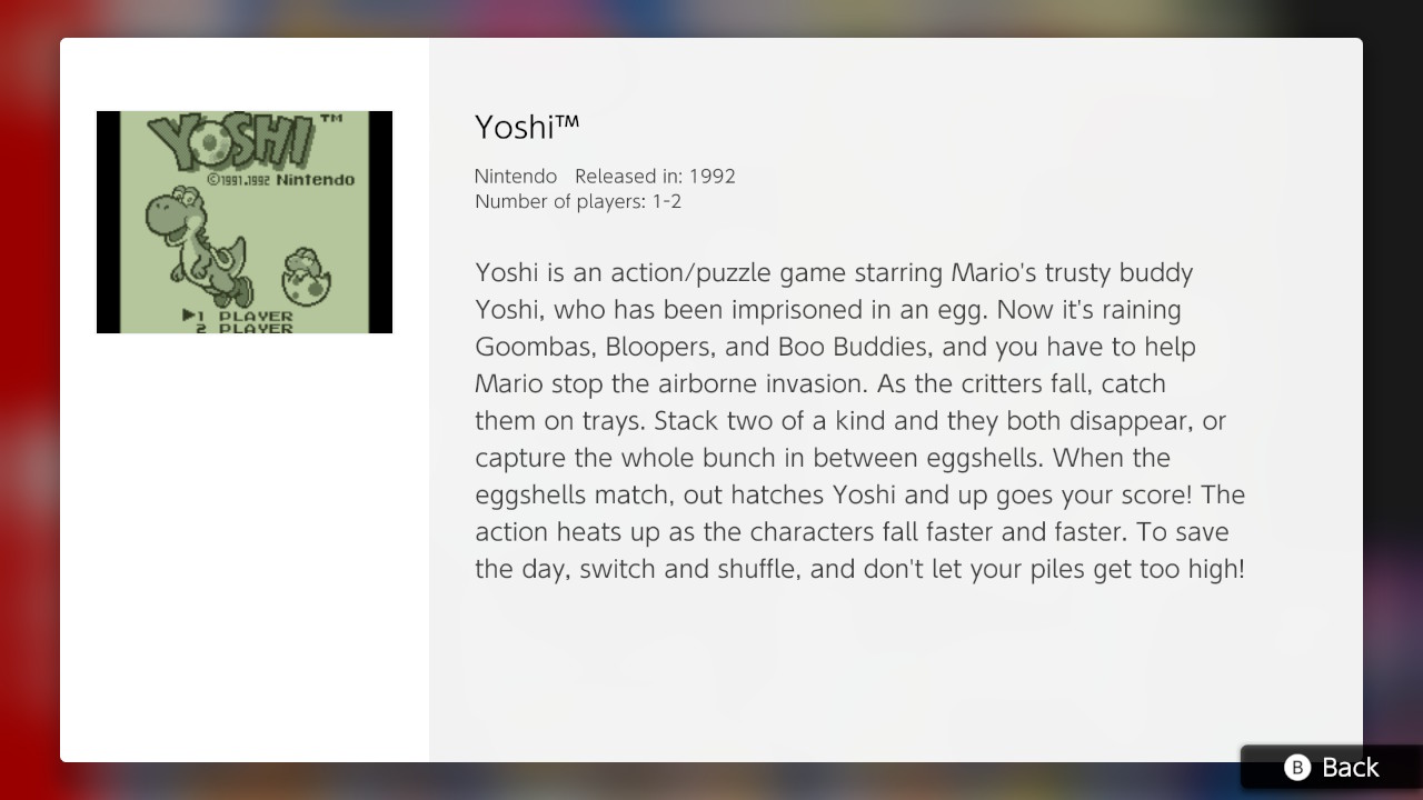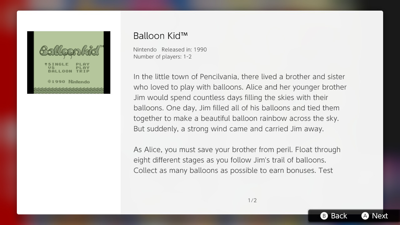 Nintendo ha realizado la distribución de la actualización a la versión 3.1.0 de Game Boy – Nintendo Classics, añadiendo a Balloon Kid / Ballon Fight GB y Yoshi (Yoshi no Tamago) al catálogo del servicio.